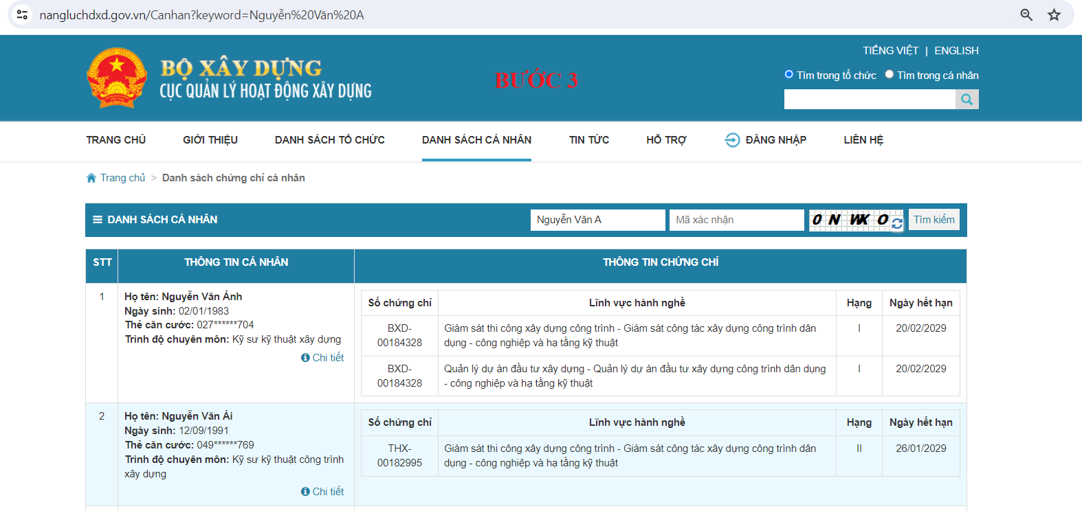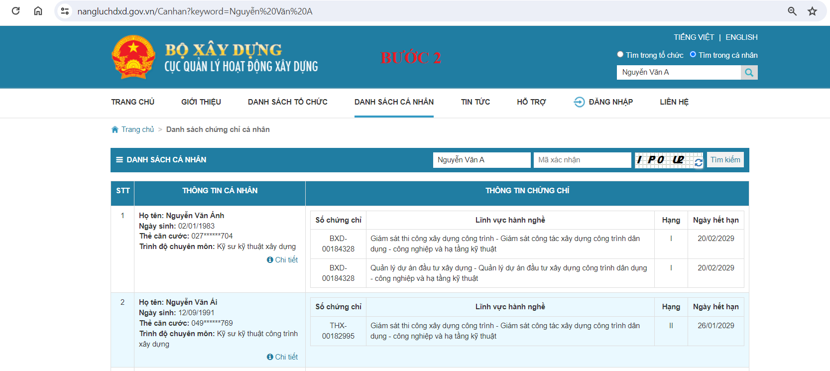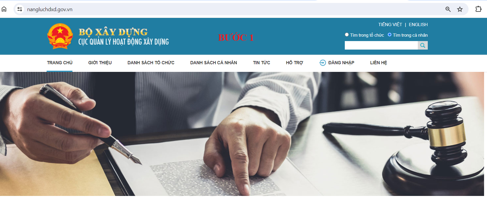 | 1 | Bước 1 | ![]() ![]() | + Truy cập website: https://nangluchdxd.gov.vn+ Lựa chọn tìm trong cá nhân/tổ chức |